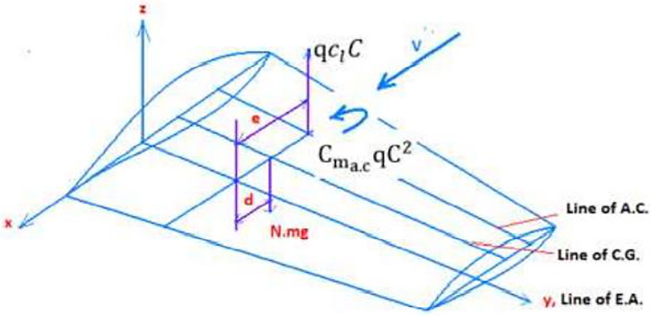The aerodynamic lift per unit span follows from strip theory, where the lift curve slope cα′ (typically 5.5 to 6.5 per radian for subsonic airfoils) acts on the total angle of attack including both the rigged angle αs and the elastic twist Θ. The dynamic pressure q grows quadratically with flight speed. The aerodynamic moment about the elastic axis includes contributions from the pitching moment at zero lift and from the lift acting at distance e aft of the elastic axis, where e represents the distance from the elastic axis to the aerodynamic center.